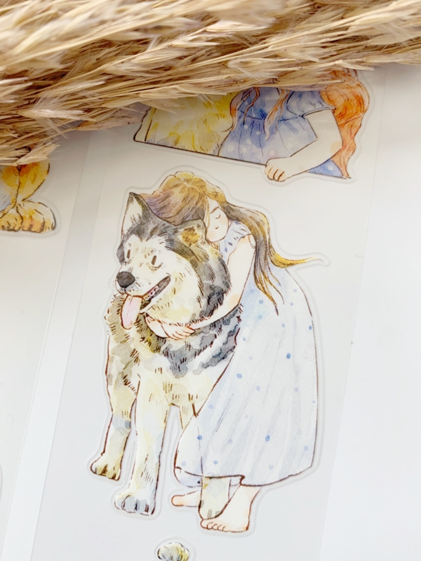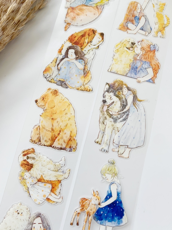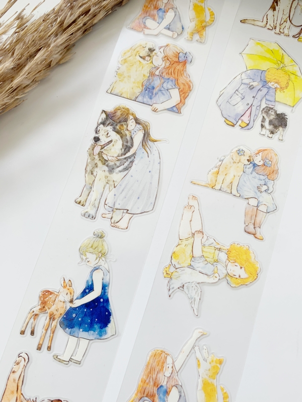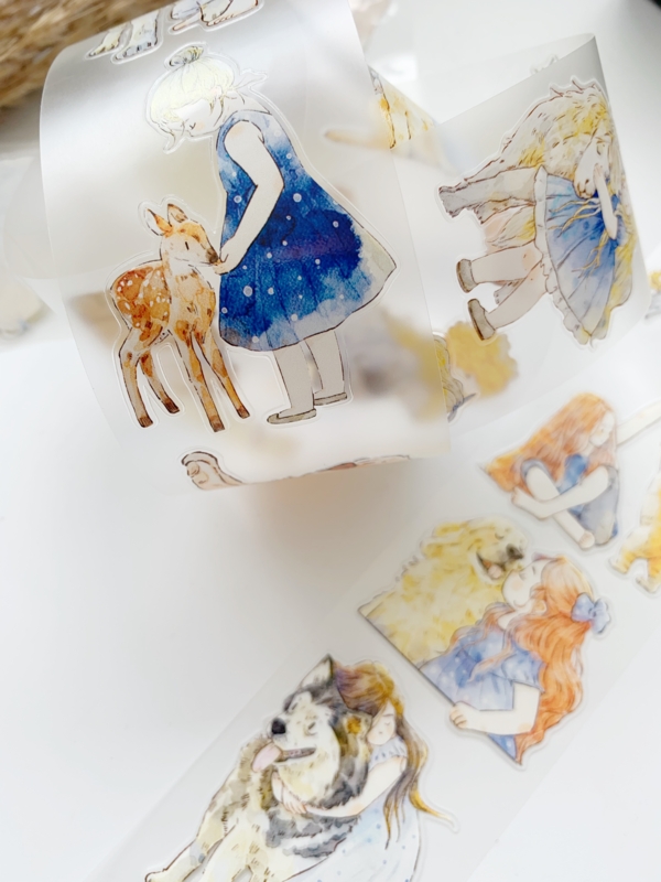 Een prachtige sample Pre-cut Pet tape van het merk DING.DING. Op deze sample zitten veel stickertjes, dus je hoeft de afbeelding niet uit te knippen! Dit tape is van hoge kwaliteit en de kleuren zijn prachtig. Erg leuk om in je journal te gebruiken.