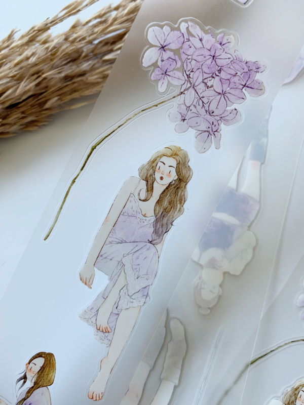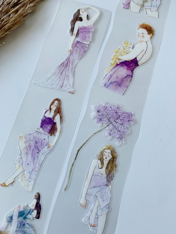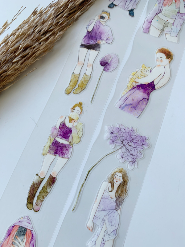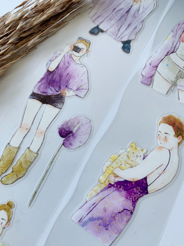 Een prachtige sample Pre-cut Pet tape van het merk DING.DING. Op deze sample zitten veel stickertjes, dus je hoeft de afbeelding niet uit te knippen! Dit tape is van hoge kwaliteit en de kleuren zijn prachtig. Erg leuk om in je journal te gebruiken.