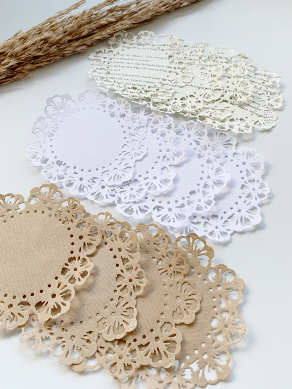 Een leuk pakketje met 12 doily's. Er zitten 3 verschillende designs in, kraft, wit en boek papier. Van elk 4 stuks.