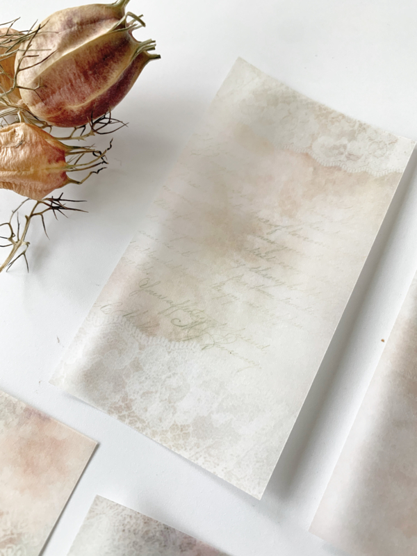 Dit prachtige bundeltje papier bestaat uit 5 verschillende designs. Van elk design zitten 4 items in het pakketje. In totaal bestaat dit pakketje dus uit 20 items. Het is prachtig papier van hoge kwaliteit, ideaal om te gebruiken in je journal.