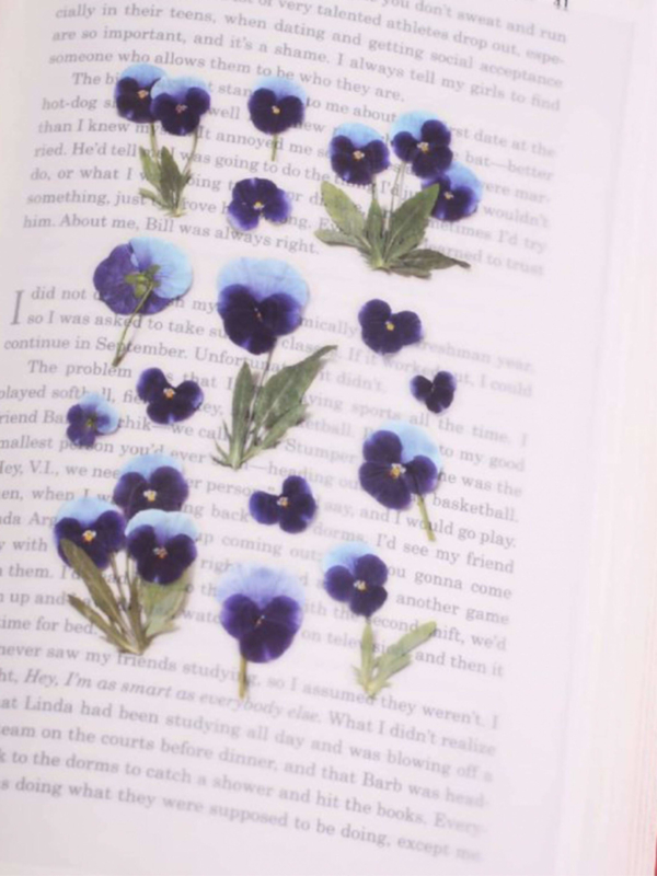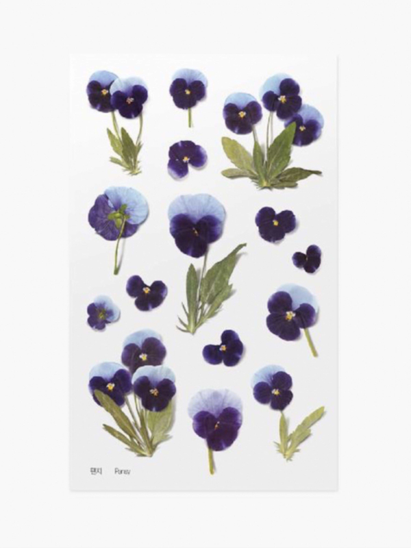 A sheet of transparent stickers contains images of pressed flowers. The images are lifelike and because shadow has been added, it looks like you are adding a real pressed flower to your work.