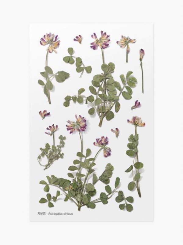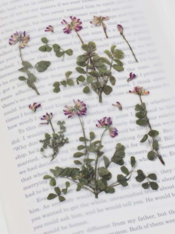 A sheet of transparent stickers contains images of pressed flowers. The images are lifelike and because shadow has been added, it looks like you are adding a real pressed flower to your work.