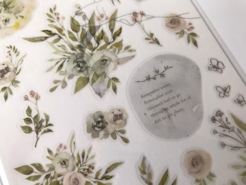 A nice package full of Print-on stickers from the brand MU. The stickers are of high quality and very nice to use in your journal. The shadows used with the stickers make it look lifelike. The stickers look best on a light background. It is convenient to use the stick when rubbing the stickers. This way there are no wrinkles and the sticker adheres nicely to the surface.