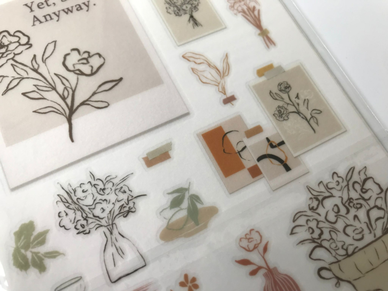 A nice package full of Print-on stickers from the brand MU. The stickers are of high quality and very nice to use in your journal. The shadows used with the stickers make it look lifelike. The stickers look best on a light background. It is convenient to use the stick when rubbing the stickers. This way there are no wrinkles and the sticker adheres nicely to the surface.
